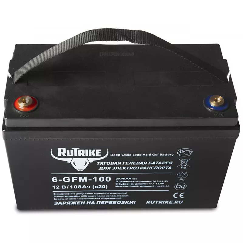 Тяговая аккумуляторная батарея RuTrike 6-GFM-100 отличается высокой производительностью, низкой скоростью саморазряда и длительным сроком хранения. Также отличительной чертой этих высококачественных аккумуляторных батарей является превосходная способность восстановления после глубокого разряда.