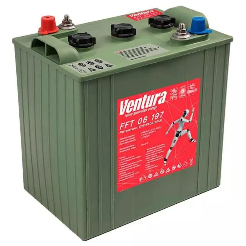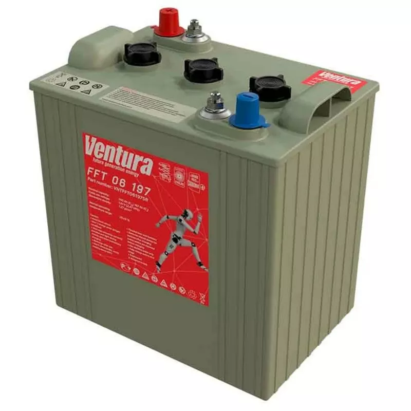 Тяговый аккумулятор Ventura FFT 06 197 производится ёмкостью C5 197 Ач и напряжением 6 В с применением технологии WET. Главная особенность этой батареи — продолжительный срок службы: до 1000 циклов при DOD = 60%. Внутри тягового АКБ Ventura FFT 06 197 расположены трубчатые пластины из специального сплава. Это обеспечивает быструю подзарядку батареи за счёт низкого внутреннего сопротивления. Тяговый аккумулятор Ventura FFT 06 197 разработан специально для работы в тяжёлых условиях. Эксплуатировать батарею можно даже в экстремальных условиях.