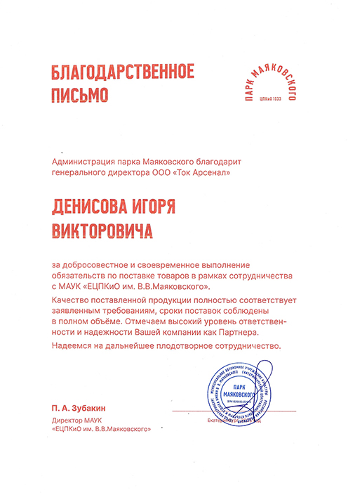 Решение: В октябре 2025г. Компания Ток Арсенал выиграла тендер на поставку аккумуляторов ЕЦПКиО им. В.В. Маяковского. Обязательства были выполнены качественно. Заказчик остался доволен.