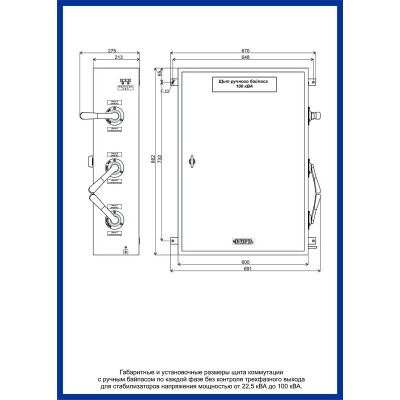Внутри щита, закрытого дверцей с замком, расположены клеммные блоки для подключения сетевых подводов, стабилизаторов напряжения переменного тока Lider и потребителей. На правой стенке расположены три выключателя-разъединителя.