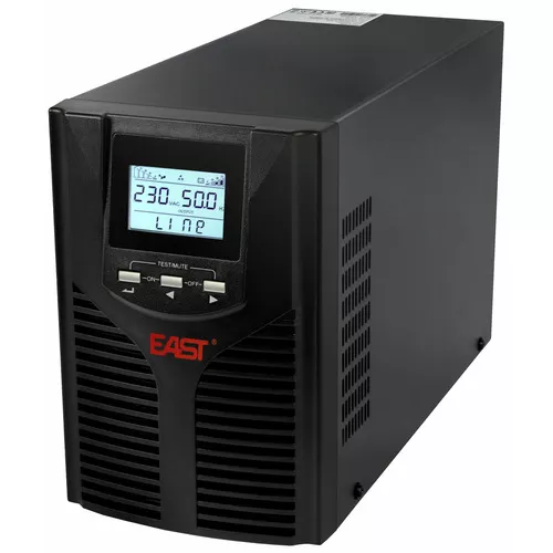 ИБП East серии EA900Pro относятся к классу online источников, работа которых происходит по следующему принципу: на первом этапе входное переменное напряжение внешней электросети (AC) преобразуется в постоянное напряжение (DC), далее встроенный в источник инвертор преобразует постоянное напряжение в переменное. Параметры напряжения на выходе ИБП находятся под постоянным процессорным контролем и поддерживаются с высокой точностью. Этим достигается эффект независимости выходного напряжения ИБП от внешней электросети и обеспечивается высокая степень защиты подключенной к ИБП нагрузки.