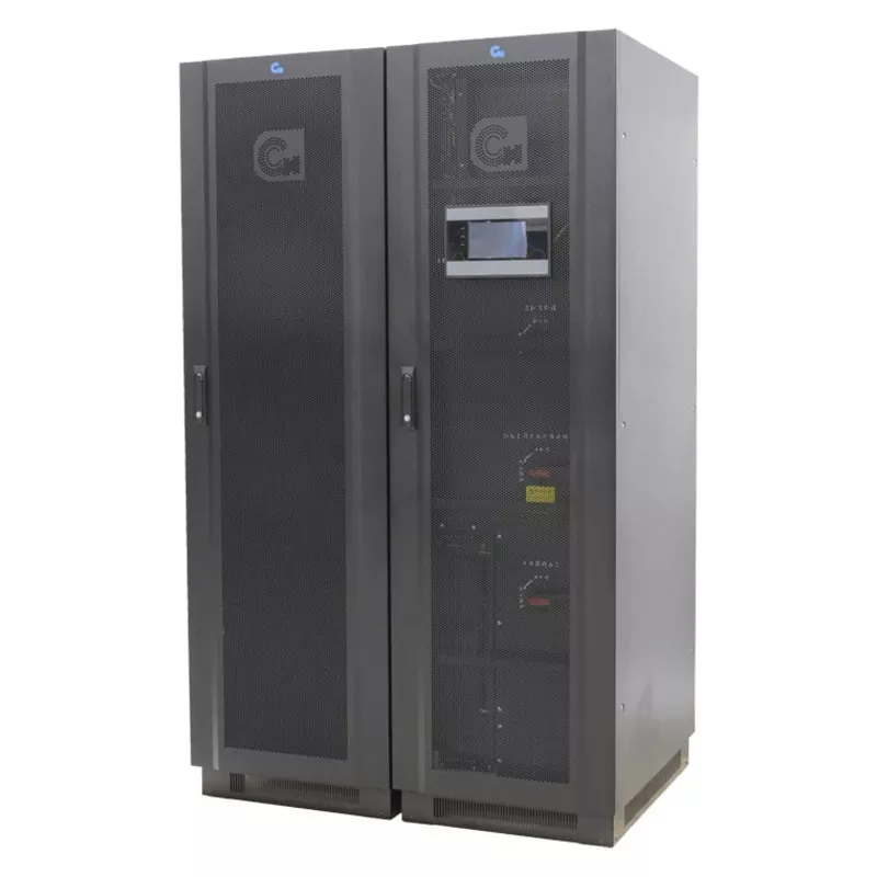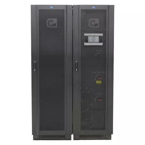 Модульный ИБП СИП380А400МД20.10-33/50 двойного преобразования, с трехфазным входом и выходом, полной мощностью 400 кВт. Предустановлено восемь силовых модулей мощностью по 50 кВт. Подключение внешнего батарейного кабинета. Выходной коэффициент мощности 1,0.