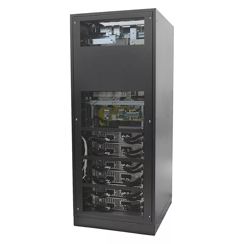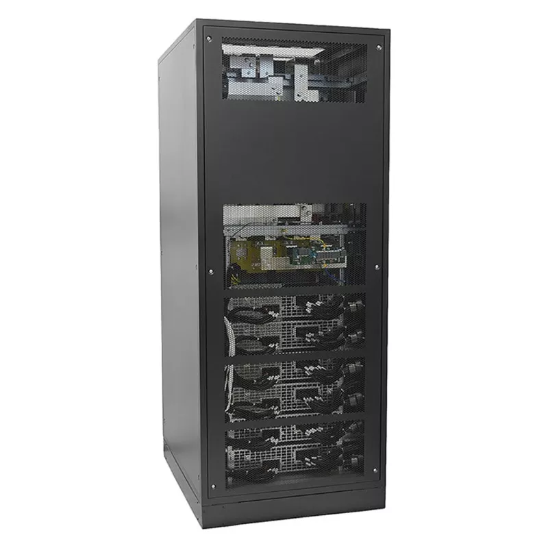 Онлайн ИБП СИП380А500МД20.10-33/100 двойного преобразования, с трехфазным входом и выходом, полной мощностью 500 кВА. Предустановлено пять силовых модулей мощностью по 100 кВА. Подключение внешних батарейных кабинетов, в том числе LFP.