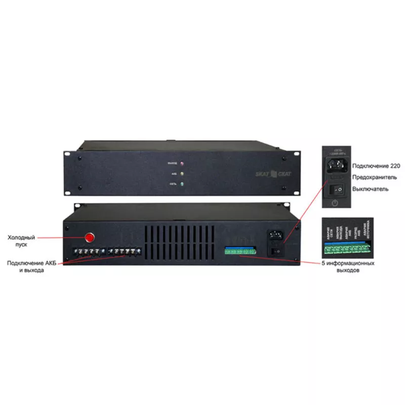 - Возможность восстановления работоспособности источника при подключении исправной и заряженной внешней АКБ и отсутствии напряжения питающей сети («холодный запуск»)