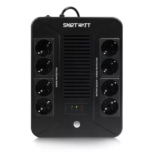 SMARTWATT UPS SAFE PRO — универсальный источник бесперебойного питания, предназначенный для защиты офисного и торгового оборудования, а также для бытового применения. ИБП оснащен 8 розетками, имеет интуитивно понятную LED-индикацию для обеспечения безопасной работы компьютерной и другой техники. При необходимости ИБП можно разместить на стене для экономии пространства на рабочем месте или для удобства пользователя.